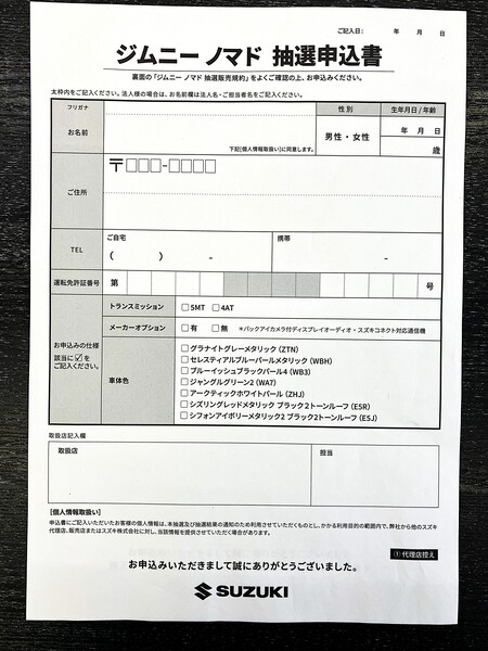 お知らせ 2026.01.30 ジムニーノマド受注再開です!! スズキ、ジムニーノマド本日より受注再開いたします。 本日から2月28日迄を納車順を決定するための抽選申込期間といたします。期間終了後に納車順を決定いたしますので先着ではございません。ですが人気車ですのでこの機会に是非ともお申し込みをお願いいたします。 PDFを開く 一覧へ戻る